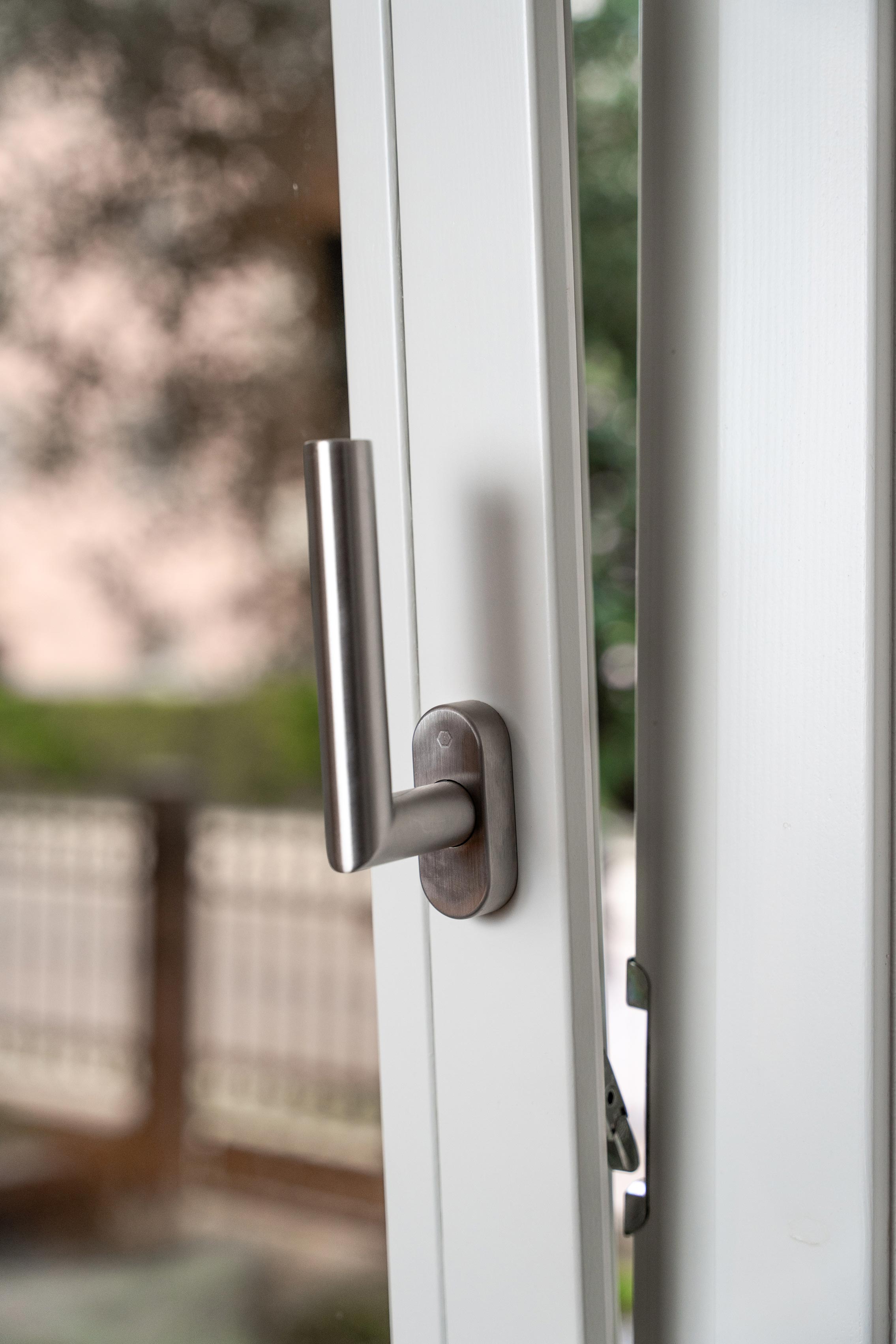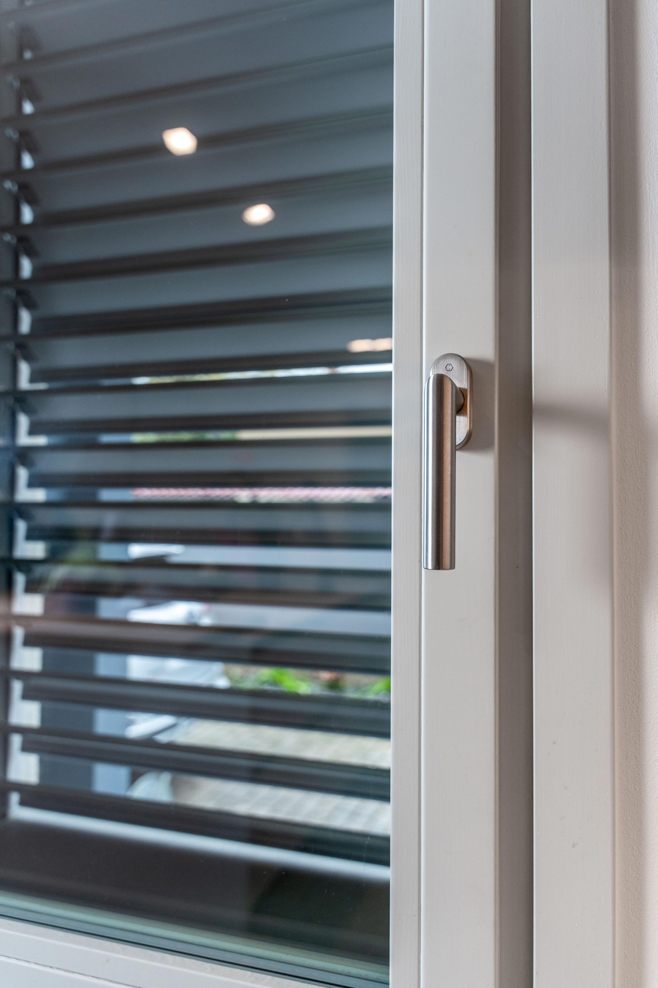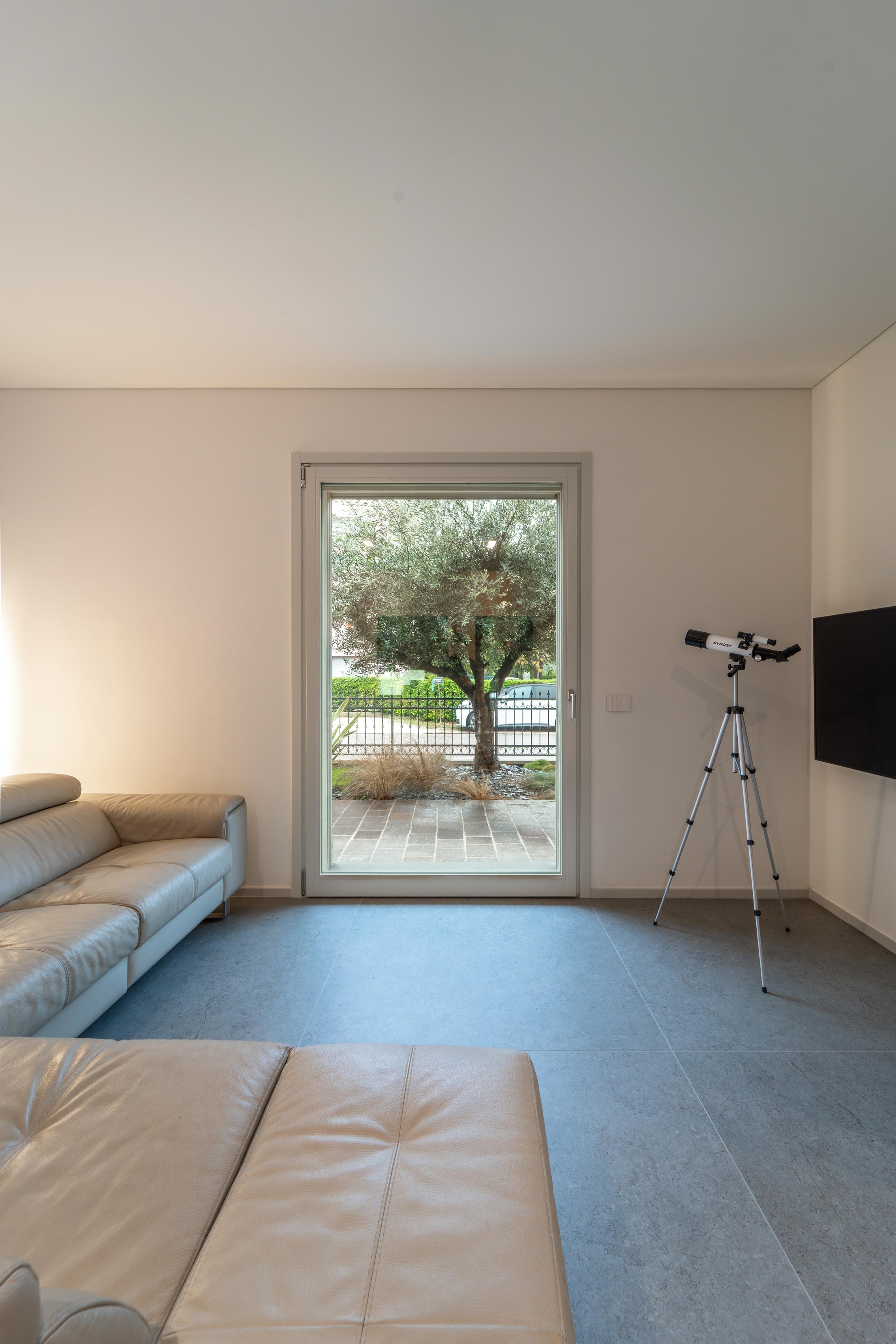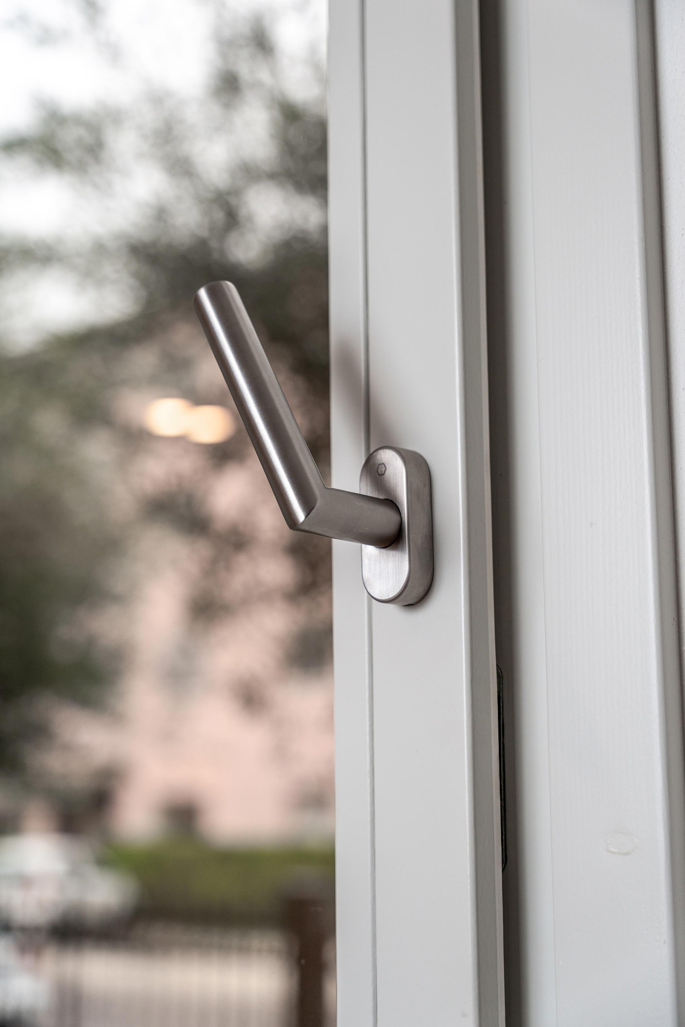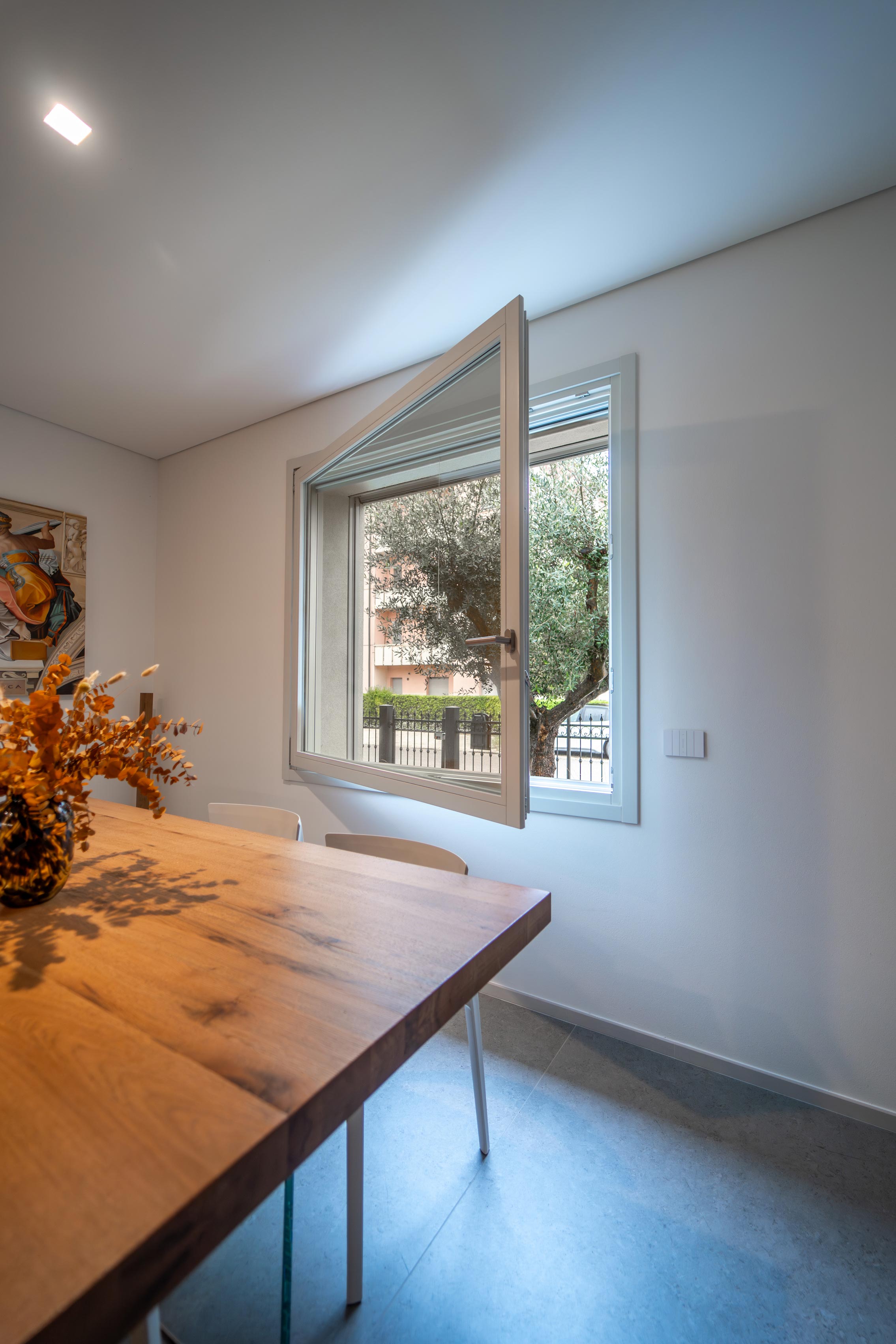 Le ampie superfici vetrate aprono lo spazio verso l’esterno, lasciando che la luce naturale diventi parte integrante dell’architettura. Gli infissi in legno disegnano un ritmo dinamico e vitale: la casa si adatta al tempo, alle stagioni, al respiro del paesaggio.